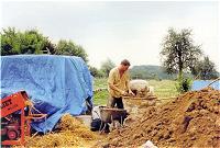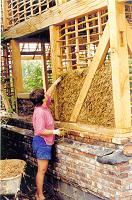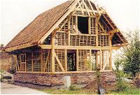 Sur les Hauts de Flobecq blotti entre les hameau Sainte-Anne et Tournibois, le gîte Het Leemhof attire les regards des baladeurs impénitents. Son concepteur, Erik Telen l'a construit à l'ancienne, de ses propres mains. Touristes et curieux se pressent déjà aux portes de la trapue maison de terre et de paille. Originaires d'Anvers, Erik Telen et son épouse Gerd ont jeté leur dévolu en 1992 sur un paisible lopin de terre, situé à deux jets de pierre du Potelberg de La Houppe, point culminant du bossu Pays des Collines. "Nous étions à la recherche d'un coin paisible, retiré de tout. Nous avons découvert la région par accident, et en sommes immédiatement tombés amoureux. La visite du terrain s'est faite un samedi de décembre. Le lundi suivant, nous avons signé l'acte de vente", se souvient Erik Telen, aujourd'hui contrôleur au ministère des finances. Collinard d'adoption à l'imagination débordante, Erik est aussi de ceux qui ont "une brique dans le ventre" et de l'or dans les doigts. Il se passionne pour les théories de l'architecture à l'ancienne et imagine d'édifier dans son nouveau domaine un gîte rural à l'aide de matériaux basiques "Par souci d'écologie et pour retrouver un peu de cet esprit du passé", nous confie-t-il. Il introduit son dossier à l'urbanisme, d'après les plans de l’ architecte P. Claes que l'idée du pan de bois a séduit. Le permis de bâtir lui est refusé dans un premier temps, l'urbanisme estimant que ce type de construction risque de faire tache dans le paysage flobecquois ! Mais à force de ténacité et après maintes démarches administratives, le couple obtient finalement satisfaction et peut enfin s'attacher à entamer les premiers travaux. La technique du pan de bois, c'est d'abord un réseau dense de branchage entrelacé (clayonnage) et soutenu par une armature de poteaux en bois. Deux mille poutres de chênes ont été nécessaires pour la construction du Leemhof ! Préparée avec de la paille de lin, l'argile est maçonnée entre les colombages et plaquée sur le clayonnage. L'opération est réalisée par l'extérieur et l'intérieur, en pétrissant la matière pour obtenir une bonne liaison avec la structure. "Pour le pan de bois, on travaille avec des matériaux sains et à portée de main. La terre est une matière première disponible et peu chère", continue Erik, l'autoconstructeur qui s'est souvenu qu'autrefois on se servait de l'urine de cheval pour l'humidification de certains mélanges argileux. "C'est la meilleure protection contre l'humidité", martèle M. Telen. "J'en ai utilisé plus de 6000 litres, mais j'avoue qu'il n'a pas été facile de faire la récolte du précieux liquide. Les propriétaires des manèges de la région m'ont souvent regardé avec curiosité !". L'aspect peu conventionnel du bâtiment suscite la curiosité du